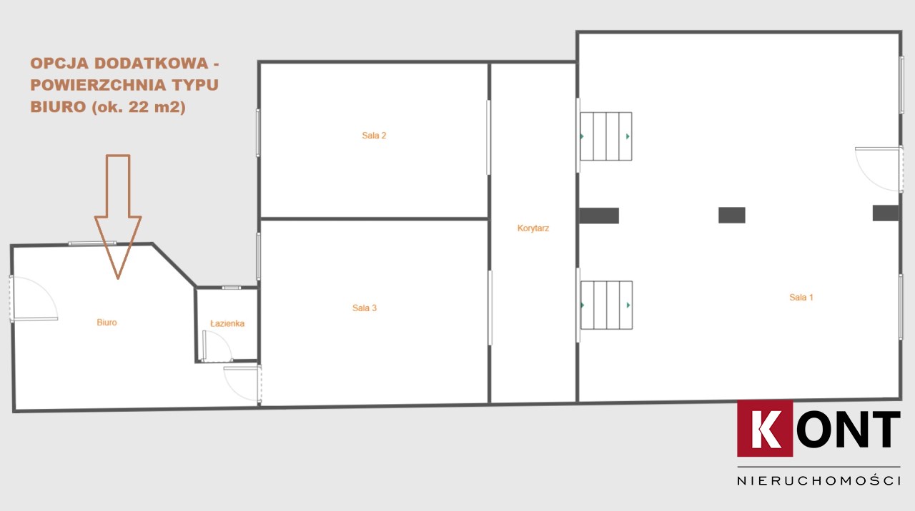 Lokal posiada główne wejście od strony ul. Krowoderskiej. Istnieje możliwość dokupienia dodatkowego lokalu, który można łatwo połączyć z lokalem głównym. Dodatkowa przestrzeń to lokal mieszkalny o powierzchni 21,5 m2 z osobnym wejściem od strony oficyny. Ta część może też być wykorzystana jako np. zaplecze biurowe dla części głównej albo mieszkanie służbowe.