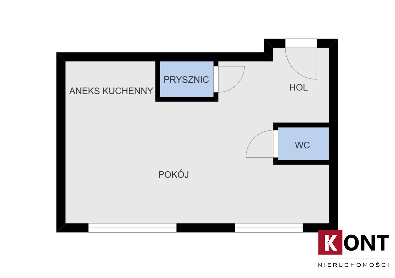 Mieszkanie ma tzw. otwarty układ z wyodrębnionym pomieszczeniem WC oraz osobnym pomieszczeniem dla kabiny prysznicowej.