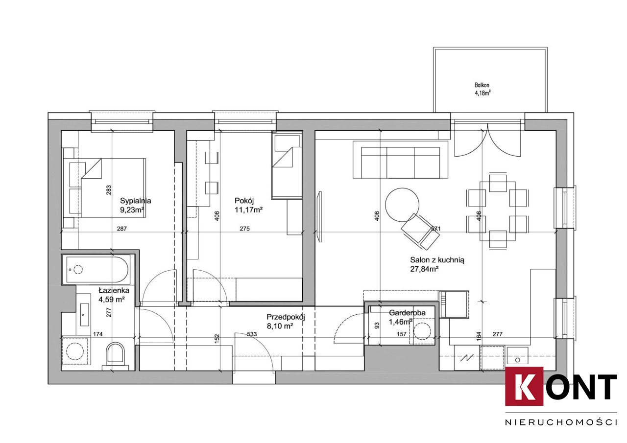 – salon z aneksem kuchennym 27,84 m2 (z wyjściem na balkon 4,18 m2),